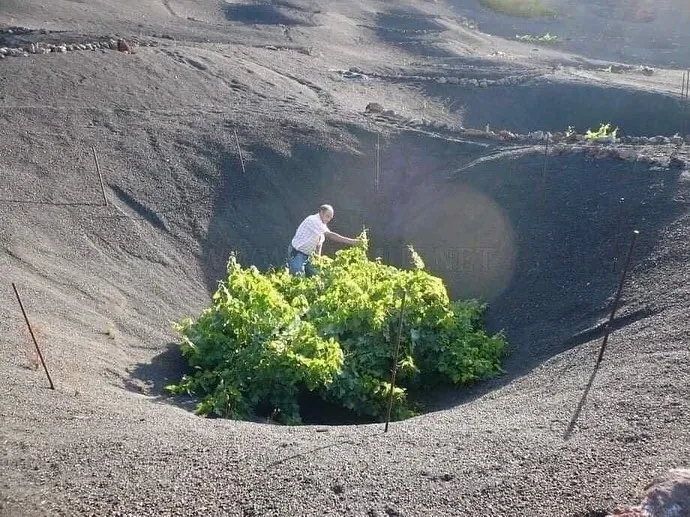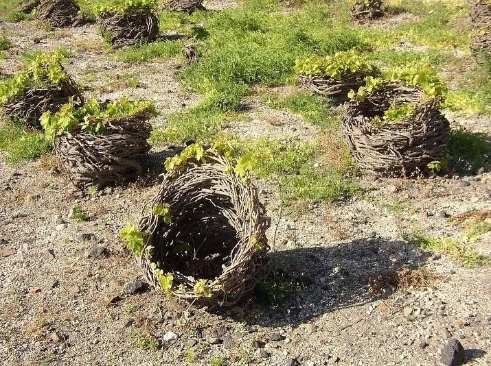Los soportes de uva se plantan específicamente en pozos de caza con una anchura de hasta varios metros. Esto se hace para hacer más fácil que las raíces lleguen a la capa de suelo fértil y mantener la humedad de las uvas. Prácticamente no hay lluvia aquí, no hay riego artificial, las plantas se alimentan del rocío, concentrando las paredes de los conos que lo rodean.