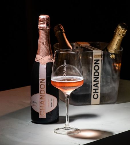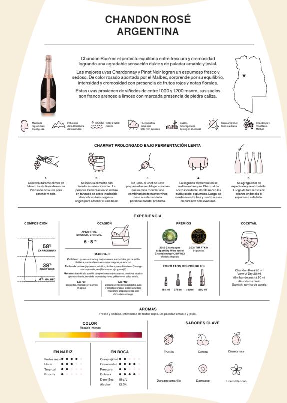 CHANDON Rosé, uno de los íconos de la marca, es el equilibrio perfecto entre frescura y cremosidad, logrando una agradable sensación dulce y un paladar jovial. Compuesto por las mejores uvas Chardonnay (58 %), Pinot Noir (38 %) y Malbec (4 %), que dan como resultado un espumoso fresco y sedoso que sorprende por su intensidad equilibrada, cremosidad y la presencia de notas florales y de frutos rojos.