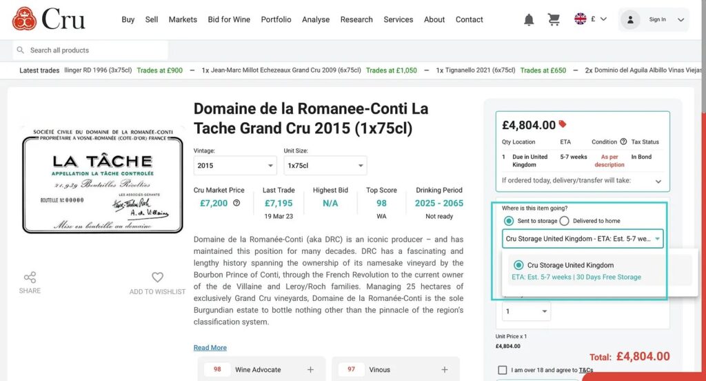 Como alternativa, Turville Valley Wines ofrece la misma botella a £4500, lo que podría aumentar tus ganancias en £300 si su tiempo de entrega es más rápido que el de Cru. Sin embargo, nunca les he comprado antes, así que no estoy seguro de su servicio. Si su tiempo de entrega es más rápido que el de Cru, podría valer la pena intentarlo.
