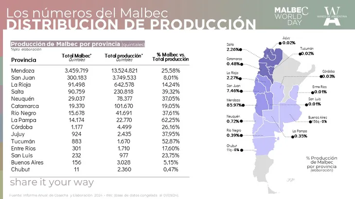 De las 18 provincias argentinas que registran viñedos de Malbec, Mendoza se mantiene al frente del ranking con mayor superficie del varietal con el 84,69% (39.856,4 ha), seguida de San Juan con el 6,08% (2.861,9 ha), y Salta con el 3,64% (1.714,3 ha).