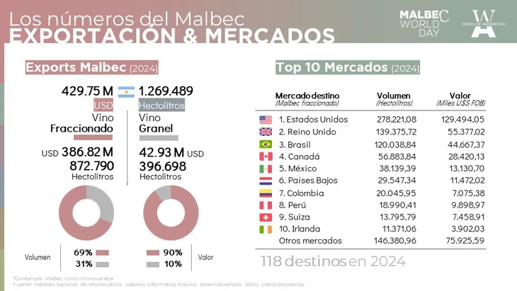 En lo que se refiere al alcance del Malbec en el mercado externo, el informe de WofA precisa que hay 118 países que recibieron al menos un envío de este varietal durante 2024.