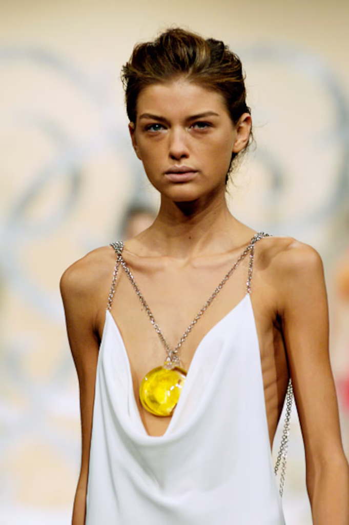Federico Antelo, Director Escuela de Moda del IED Madrid, Artista y Diseñador Textil, cree que el ideal de la delgadez en los primeros años 2000 tuvo que ver, como siempre sucede en la moda, con una necesidad de cambio. “Cada vez que hay un cambio de paradigma o se impone una cosmovisión diferente, es acompañado por un sisma estético que es testigo de esa transformación. La delgadez es la respuesta al estereotipo inalcanzable de las supermodelos de los 90, esa salud rozagante y curvilínea de Claudia Schiffer”, apunta. “Me vienen a la mente tres diseñadores y sus estéticas sobre la pasarela por aquellos años, muy ligadas a esta obsesión por la talla ‘0′ de los 2000. Por ejemplo: los desfiles de Galliano para Dior, sobre todo en alta costura. Las colecciones de Alexander McQueen, y el Gucci de Tom Ford”. Entre las modelos hiperdelgadas de la época cita también a Kristen McMenamy o Hanne Gaby Odiele. “Los 2000 fueron una época que dejó fuera cualquier tipo de voluptuosidad, incluso el dreamteam de las tops de los 90 dejaron de trabajar, al menos por un tiempo”.