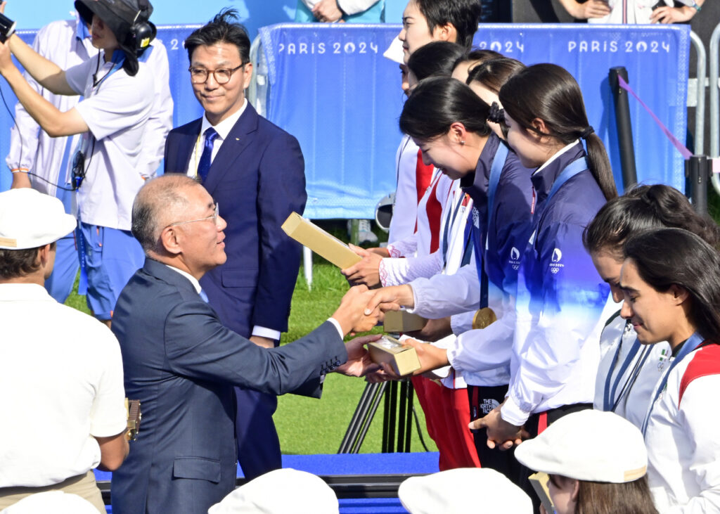“Quiero agradecer a todos los coreanos que vieron (al equipo de tiro con arco), a los que vinieron a animar al equipo aquí y a los atletas que lo hicieron muy bien a pesar de tanta presión. Practicaron muy duro y lo hicieron con determinación”, dijo el presidente ejecutivo de Hyundai Motor Group, Chung Euisun, quien asistió en persona al evento del equipo de tiro con arco femenino. Se ha desempeñado como presidente de la KAA desde 2005.