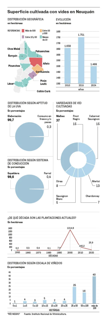 La superficie cultivada con vid en Neuquén se redujo en casi 300 hectáreas en 2024 con respecto a 2023, según los registros del INV. Porcentualmente, esto equivale a una contracción del 16,3% del área, lo que posiciona a la provincia como la de mayor caída a nivel nacional.