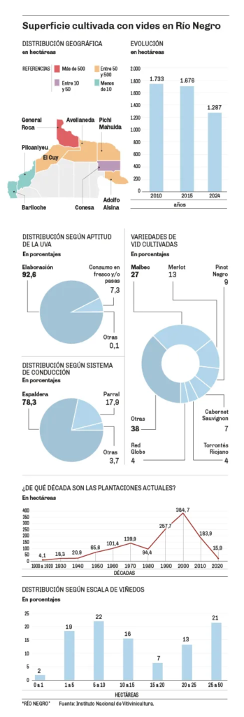 Después de Neuquén, la provincia argentina donde más se redujo la superficie cultivada con vid en 2024 fue Río Negro. En total, se dieron de baja 213,2 hectáreas en un año, lo que equivale a una contracción del 14,2% respecto del 2023. Si la comparación se hace respecto de 10 años atrás, la caída es mayor: se perdieron 389,2 hectáreas desde 2015.