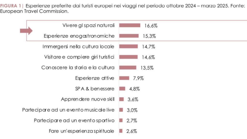 Para los turistas europeos -se lee en una ficha del informe- la comida es una presencia estable, junto con la naturaleza y la cultura, entre las experiencias más deseadas. A corto plazo (octubre de 2024 – marzo de 2025), estas propuestas representan el 15,3% (gastronomía y vino), el 16,6% (naturaleza) y el 14,7% (cultura) respectivamente en las intenciones de los ciudadanos europeos (Figura 1). Se trata de una gran cuenca de mercado -potencialmente más de 60 millones, de los cuales 20,6 millones sólo para la alimentación y el vino- con cifras estables en comparación con 2023.