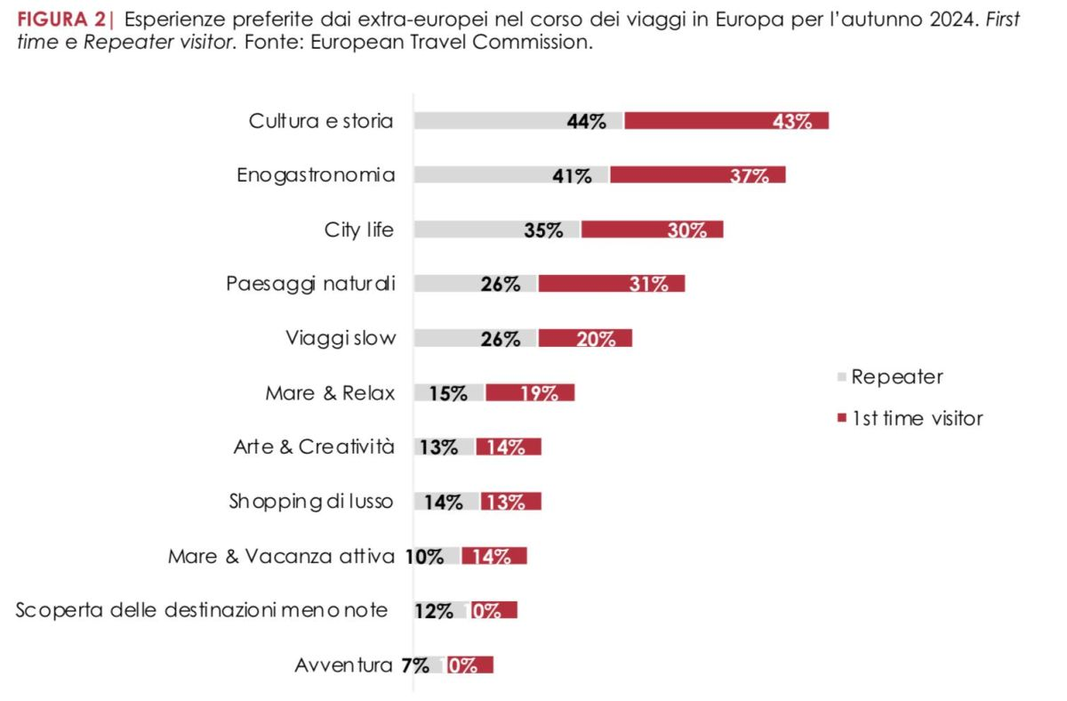 Para los turistas europeos -se lee en una ficha del informe- la comida es una presencia estable, junto con la naturaleza y la cultura, entre las experiencias más deseadas. A corto plazo (octubre de 2024 – marzo de 2025), estas propuestas representan el 15,3% (gastronomía y vino), el 16,6% (naturaleza) y el 14,7% (cultura) respectivamente en las intenciones de los ciudadanos europeos (Figura 1). Se trata de una gran cuenca de mercado -potencialmente más de 60 millones, de los cuales 20,6 millones sólo para la alimentación y el vino- con cifras estables en comparación con 2023.