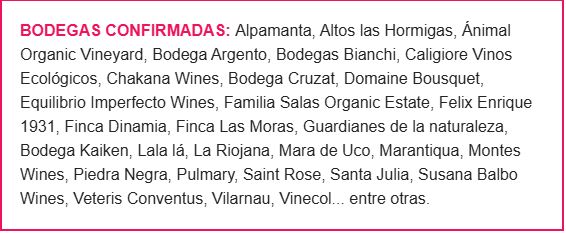 En esta nueva edición, habrá más de 30 bodegas de distintas regiones vitivinícolas del país que presentarán sus vinos orgánicos, biodinámicos, naturales, con Comercio Justo y sustentables certificados, en un ambiente relajado, con música, gastronomía y diferentes charlas sobre vino y sustentabilidad.