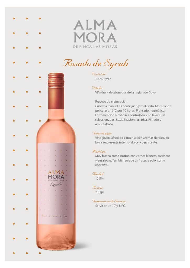 Alma Mora Syrah Rosé: Una versión fresca y vibrante del Syrah, perfecta para acompañar platos ligeros y disfrutar en cualquier ocasión.