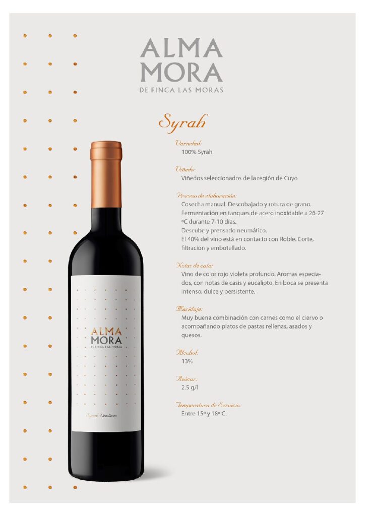 Alma Mora Syrah: Un vino expresivo que resalta la tipicidad del Syrah con un perfil frutal y suave, ideal para quienes buscan una experiencia sensorial única.