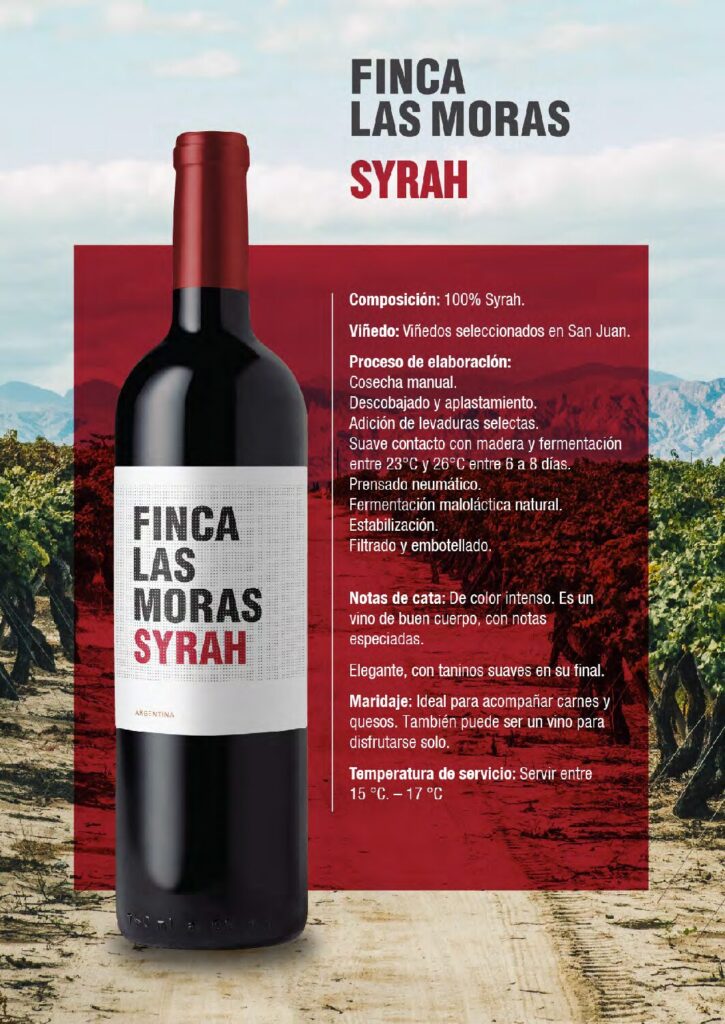 Finca Las Moras Syrah: Un vino robusto y elegante, con intensos aromas de frutas rojas y especias.