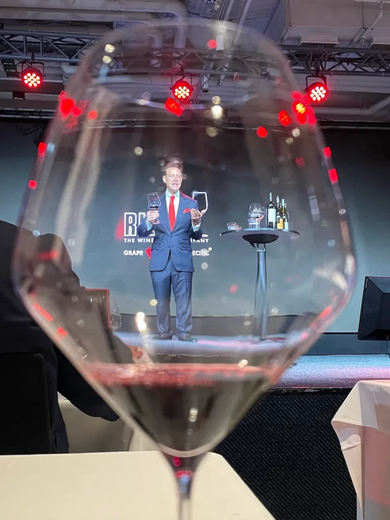 Es una buena pregunta. Y tiene una respuesta curiosa. He asistido a catas con copas de muchos tamaños diferentes. La mejor fue con Maximilian Riedel, que se ve aquí a través de su fabulosa copa de Borgoña/Barolo:
