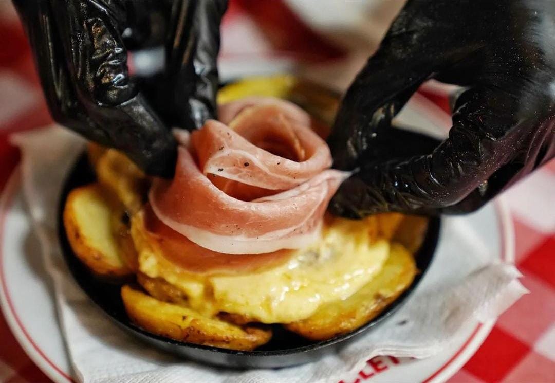 En Raclette lo servimos con carnes braseadas, con chorizo, con vegetales y la carne bovina que usamos es carne de vacío, que lo combinamos con champignon salteados en vino blanco, la carne de cerdo lo combinamos con cebolla caramelizada. También tenemos rosti que es la tortilla típica suiza que no lleva ni huevo ni cebolla, es a base de papa rallada frita con manteca y terminada al horno, donde tiene un juego de textura muy interesante porque por fuera es como papa frita y por dentro es como una papa hervida. Se le siente mucho el gusto de manteca y varía con el queso raclette. Después también tenemos sándwiches en pan de masa madre, tostones, hacemos fondue de queso, de chocolate, tenemos diferentes platos tratando de emular un poco la comida del paso suizo que es tan característica de la cultura suiza. Nosotros siempre pensamos que los suizos son más tranquilos y están dentro de las casas, y es todo lo contrario son super activos,son muy deportistas, y muy adictos y adeptos a consumir comida al paso.