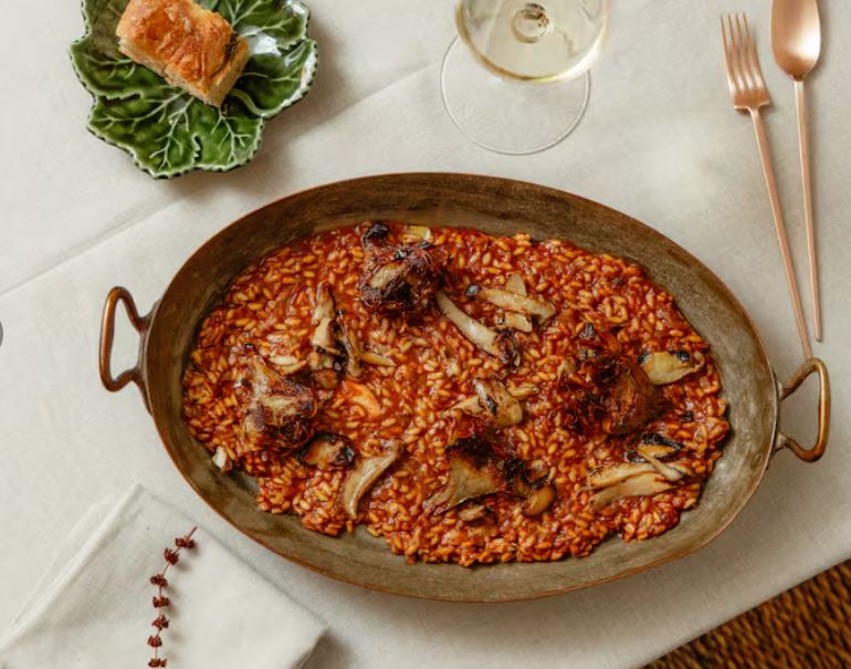 Entre los platos principales, la oferta va desde wagyu argentino al hierro con chips de boniato (44 euros), entrecot para dos personas de angus argentino (89 euros), hasta rape con salsa de jamón (32 euros), lubina salvaje con pilpil (48 euros), arroz con pulpo a la brasa y lágrimas de ibérico de bellota (45 euros por persona), o lasaña de osobuco al hierro con crema de parmesano (38 euros).