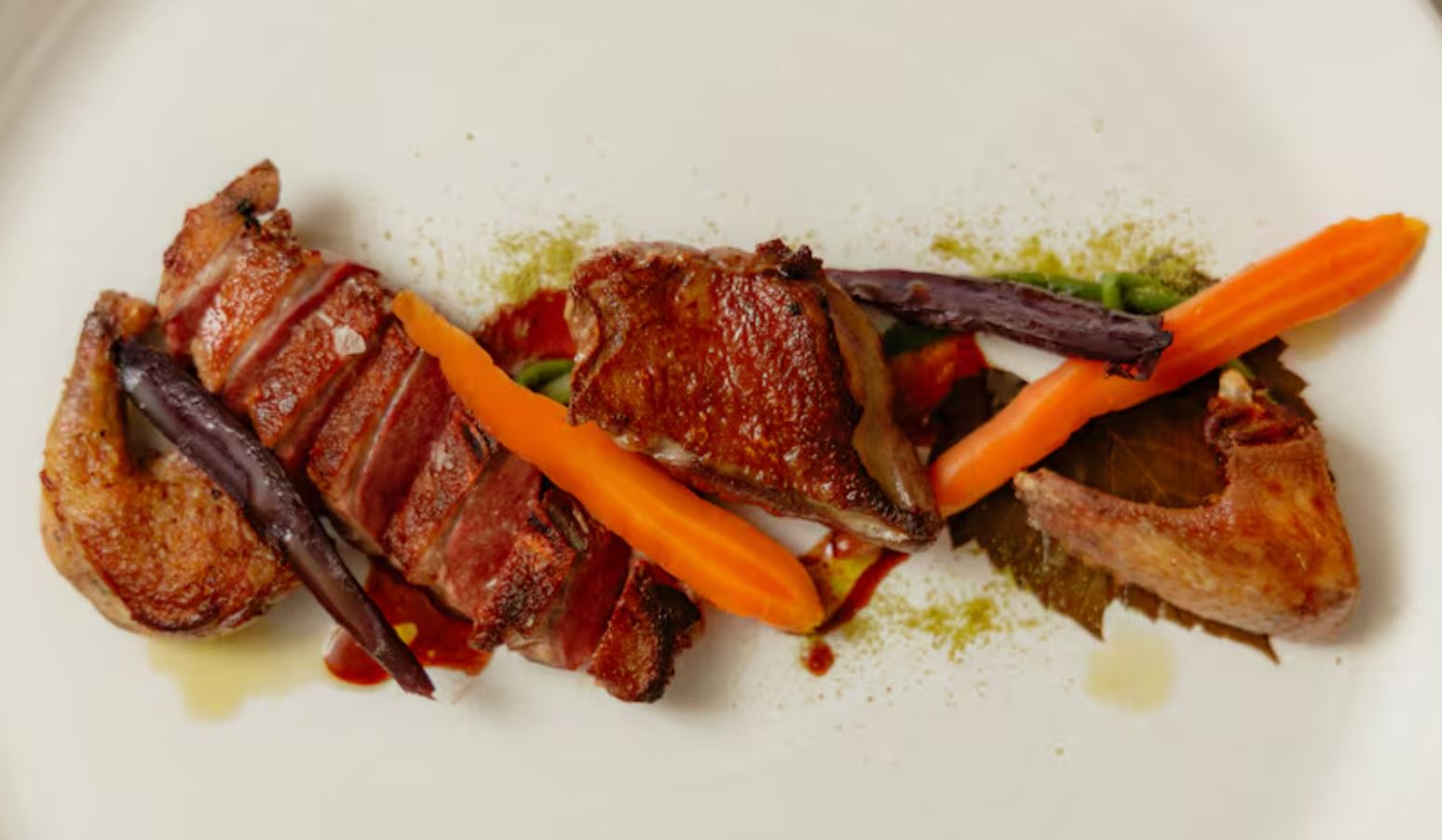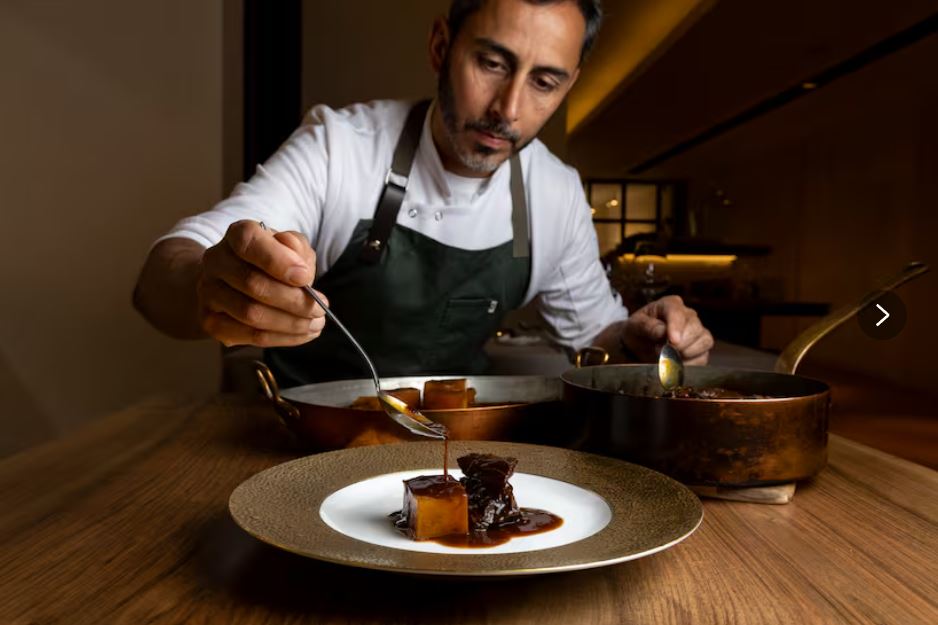 Entre los entrantes, pueden encontrarse una croqueta de copa ibérica de bellota (4 euros), setas silvestres con huevos rotos de campo y un velo de ibérico de bellota (30 euros), o foie gras de pato a la sartén con chutney de peras (30 euros). También destacan el cordero braseado en hojas de vid (25 euros) o unas mollejas de ternera doradas al hierro sobre quinoa y cítricos (32 euros).