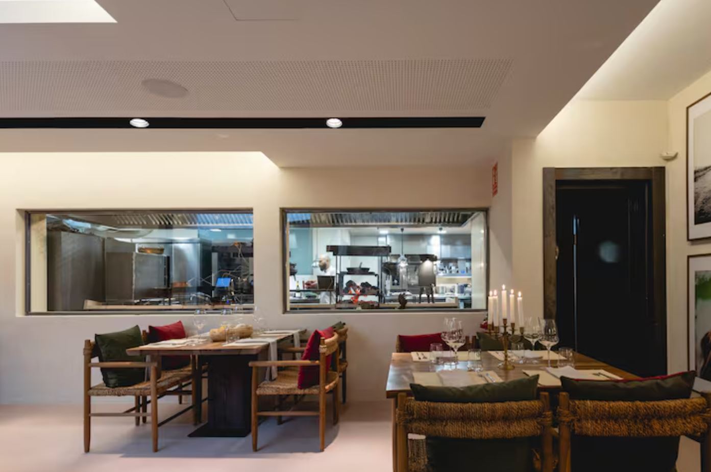 El local luce ahora un aura especial: desprende calidez y una clara sensación de hogar, algo que aquí se consigue a través del fuego —no es ninguna metáfora—, ya que desde la sala principal se disfruta, mediante generosos ventanales, de las vivas brasas y de todo lo que acontece en la cocina. Según Vela, en su tierra, cuando alguien recibe al calor de las llamas, lo hace siempre con un buen vino. De ahí una nutrida selección de etiquetas, principalmente argentinas, uruguayas y españolas, aunque también de otras zonas como Francia e Italia. Una fórmula que ya habían contrastado en el local que abrieron en 2023 en José Ignacio (Uruguay), y que ahora continúa como un restaurante efímero solo en temporada de verano.