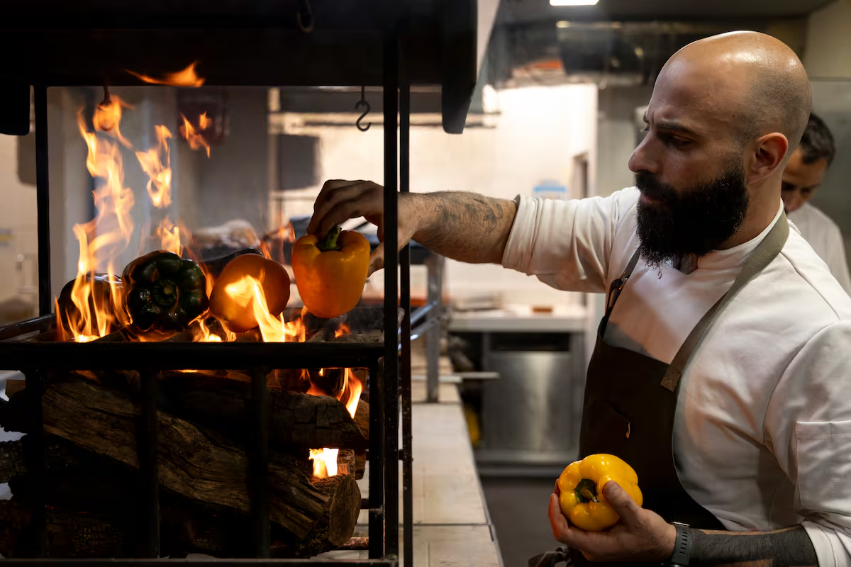 La carta se modifica cada dos o tres días, dependiendo de lo que haya en el mercado, anuncia Vela. Cuentan con un menú degustación por 120 euros (10 pases, sin bebidas), que se arma a gusto del comensal. “Hay gente que es más de pescado y otros más de carne, o prefiere la opción de verduras. No queremos imponer nada, sino que se disfrute”, aclara. Lo único que se impone es que casi todo lo que allí se elabora toca el fuego, bien directo o contenido. Hay otros platos que están exentos de las llamas, como los taquitos de atún rojo de Cádiz marinado, con papada ibérica y humo de eucalipto (29 euros), o el escabeche de bonito ahumado, stracciatella y uvas (28 euros).