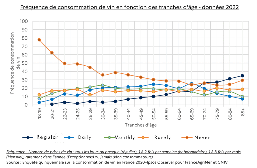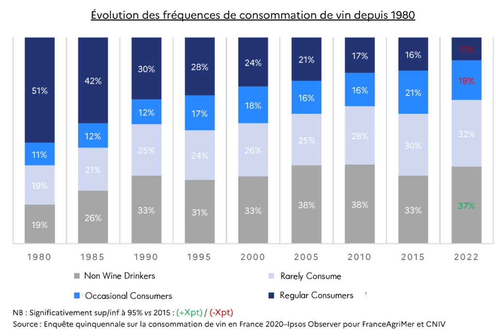 Otras investigaciones de FranceAgrimer realizadas durante las últimas cuatro décadas muestran cómo, si bien la proporción de no bebedores de vino apenas ha cambiado desde 2005, los consumidores que lo hacen ocasionalmente o rara vez han aumentado drásticamente su porcentaje. En consecuencia, el grupo de ciudadanos que se describen como bebedores habituales de vino ha pasado de representar más de la mitad de los consumidores franceses en 1980, cuando vivía en Borgoña, a menos de una cuarta parte en 2000, y a poco más de uno de cada diez en la actualidad.