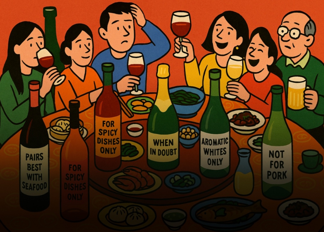 También está la cuestión del formato. La cocina china suele servirse al estilo banquete, similar a un festín familiar mediterráneo, con todos los platos servidos a la vez en una gran mesa redonda. El concepto de varios platos con maridaje individual es tan desconocido para los comensales chinos como para la mayoría de las nonnas italianas, a quienes les da igual con qué variedad de uva mariden su pasta, siempre y cuando digan «¡mangi, mangi!» a menudo.