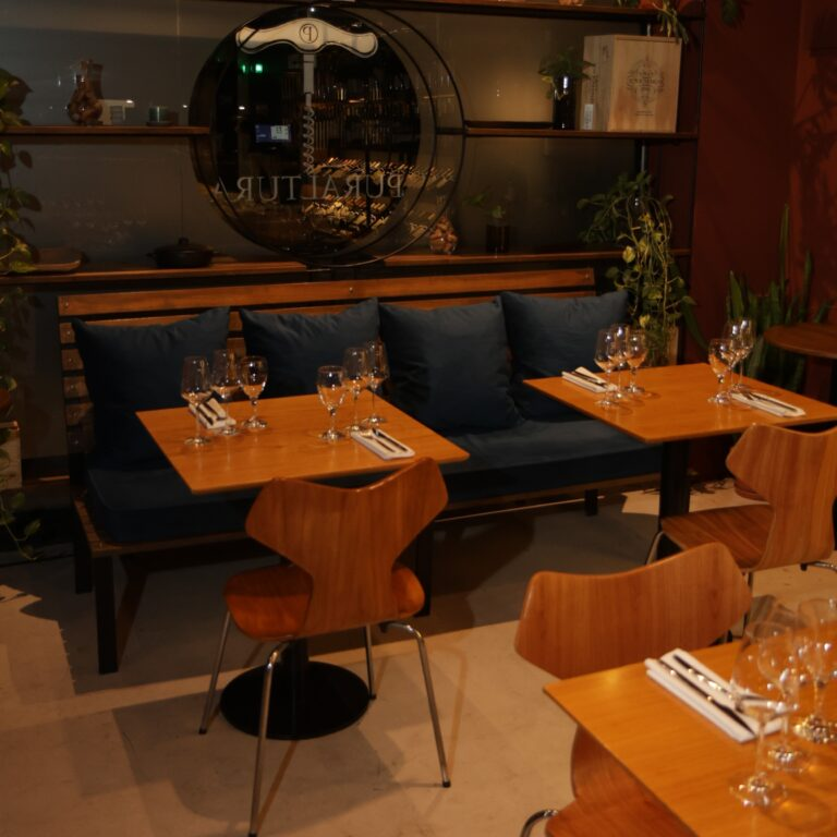 El salón tiene espacio para 22 comensales y el frente evita la exposición innecesaria a la calle y brinda intimidad. Adentro el ritmo es tranquilo, con especial paciencia y tiempo puesto por el sommelier a cargo del salón, en función de contar la propuesta, la carta y todo lo que el comensal quiere saber acerca del vino argentino. Pues, de nuevo, este es el eje de Puraltura.