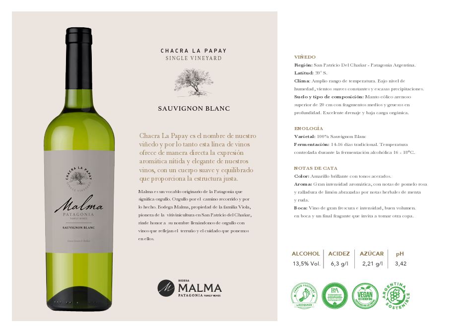 Desde la Patagonia, Chacra La Papay Sauvignon Blanc, de Bodega Malma, refleja el carácter distintivo de los viñedos de San Patricio del Chañar, una región reconocida por su amplitud térmica y sus condiciones climáticas que favorecen vinos frescos, intensos y de gran expresión aromática.