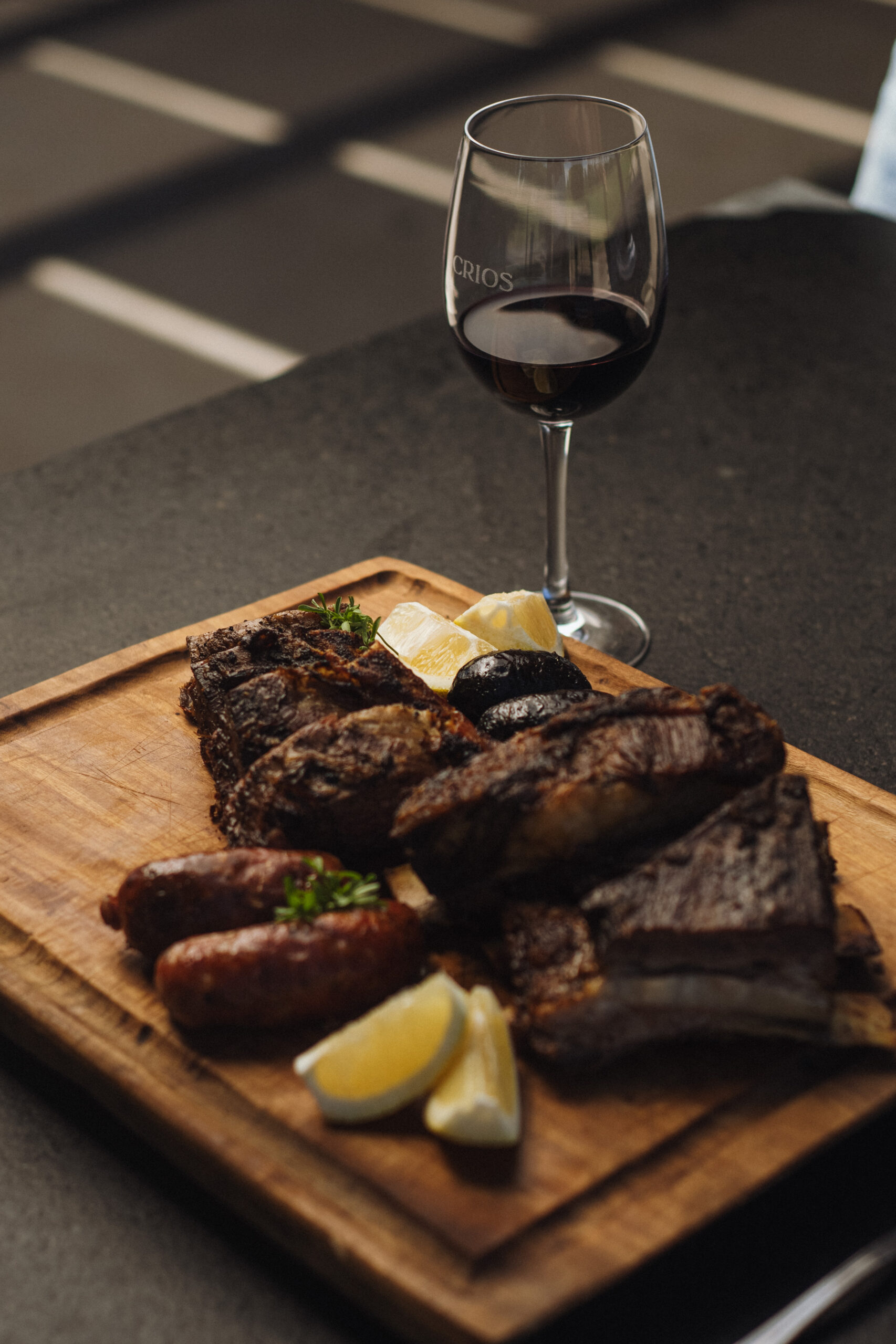 CRIOS presenta dos propuestas gastronómicas. Por un lado, el Menú de Fuegos, inspirado en las costumbres culinarias argentinas, disponible en formato de menú de pasos —que incluye panera, empanadas, distintos cortes de carne, guarniciones y postre— o bien a la carta, con opciones como tablas de quesos y fiambres, ensaladas, vegetales y diferentes cortes de carne.