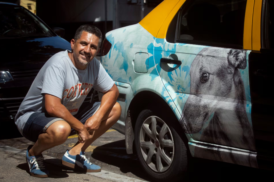 Además de taxista desde hace 34 años, Walter Perdoménico es un gran amante de las mascotas. “Si fuera por mí, llevaría sólo perros y no humanos en mi auto”, dice con una sonrisa. Su vehículo es pet-friendly y está ploteado con obras de la fotógrafa Nora Lezano y la artista plástica y escenógrafa Renata Schussheim. Son fotografías preciosas de perros que están en adopción en Fundación Viva La Vida, que se dedica a rescatar animales en situación de calle o riesgo de vida. El pasajero que sube al taxi de Walter encuentra dos códigos QR -uno para adoptar gatos y otro perros- e información de las artistas, además de consejos para el traslado de animales de compañía en taxis.