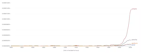 Los terroirs de los «tés de origen» son casi siempre asiáticos, lo que se traduce en préstamos léxicos del japonés y el chino. Un vistazo rápido a la herramienta Google Ngram —una aplicación lingüística que permite observar la evolución de la frecuencia de una o más palabras o grupos de palabras— revela un reciente aumento explosivo en la frecuencia de la palabra japonesa umami en los datos en francés.