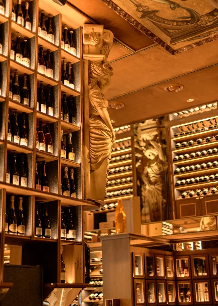 Deslumbran cientos de botellas de vinos de culto, champagnes de grandes casas y etiquetas buscadas por los enófilos más entusiastas, que conviven con una decoración planteada por Lázaro Rosa Violán, en la que llaman la atención unas columnas vintage con forma de diosas que dan un matiz solemne y de elegancia clásica al local.