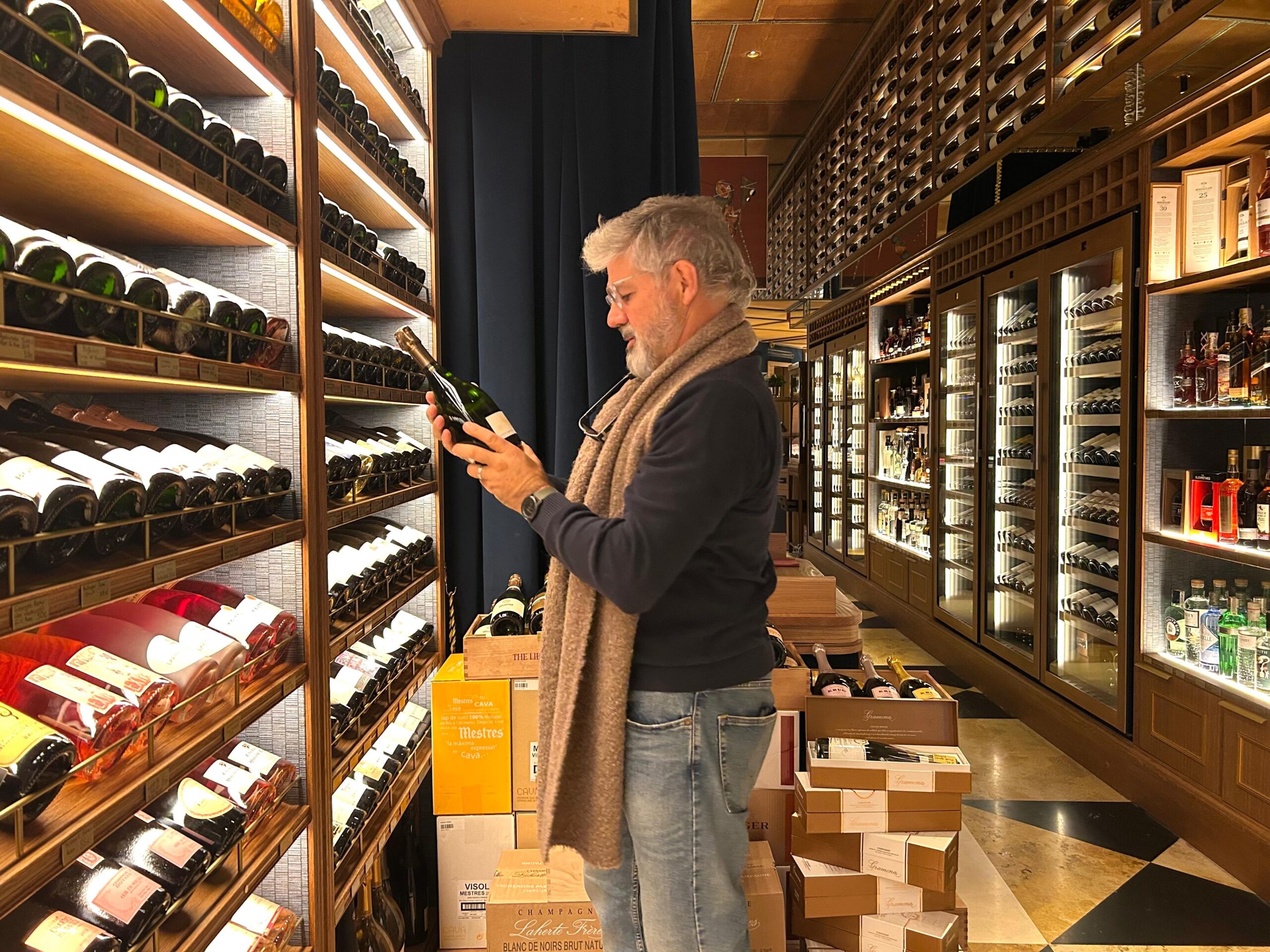 Deslumbran cientos de botellas de vinos de culto, champagnes de grandes casas y etiquetas buscadas por los enófilos más entusiastas, que conviven con una decoración planteada por Lázaro Rosa Violán, en la que llaman la atención unas columnas vintage con forma de diosas que dan un matiz solemne y de elegancia clásica al local.
