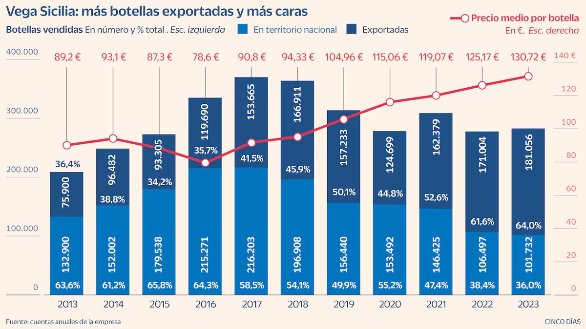 El reconocimiento internacional de los vinos de Vega Sicilia no para de crecer. Esto se ha traducido en los últimos años en un imparable incremento del negocio exterior y, en paralelo, del valor de sus botellas. En 2023, el precio medio de las mismas superó por primera vez la barrera de los 130 euros, y se ubicó en los 130,72, un nuevo récord para la bodega.