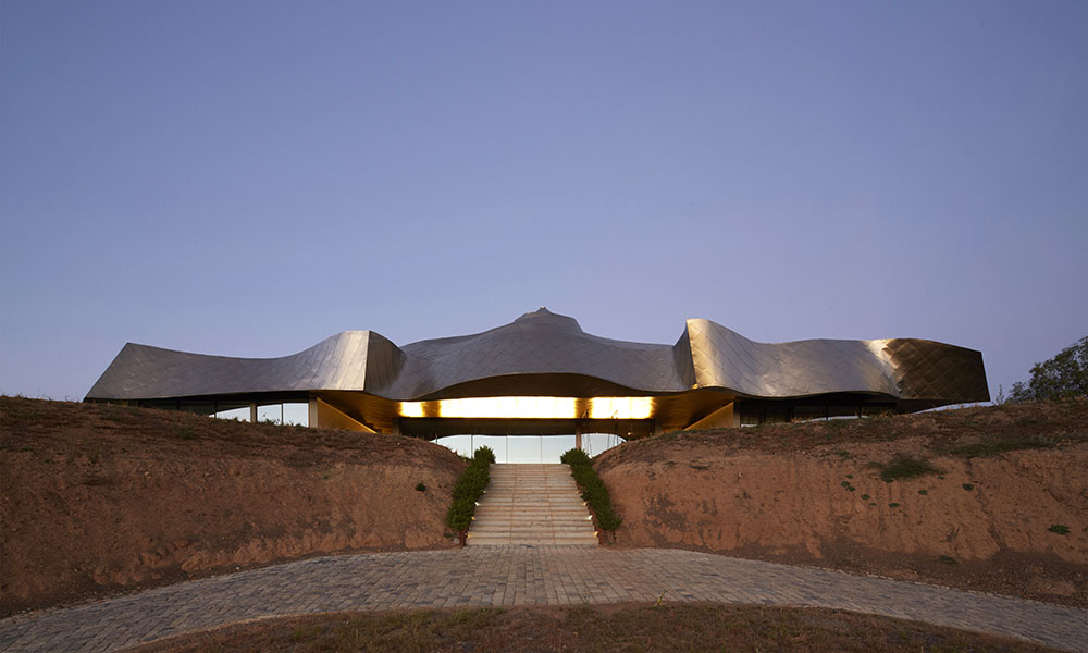 Uno de los sellos más distintivos de Vik es su arquitectura de impacto, pensada no como un objeto aislado, sino como una extensión del paisaje. En lo alto de una colina, con la cordillera de los Andes como telón de fondo, se levanta la bodega coronada por su célebre techo flotante de titanio bronceado, inspirado en las obras de Frank Gehry y Richard Serra.