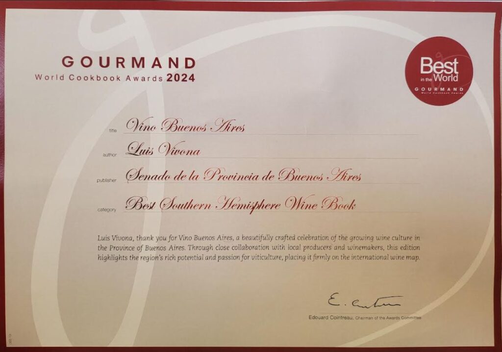 El libro “Vino Buenos Aires”, del vicepresidente primero del Senado Bonaerense Luis Vivona, fue reconocido como el mejor en la categoría “Mundo del vino en el Hemisferio Sur” en los Gourmand Awards 2025, también conocidos como los Gourmand World Cookbook Awards.